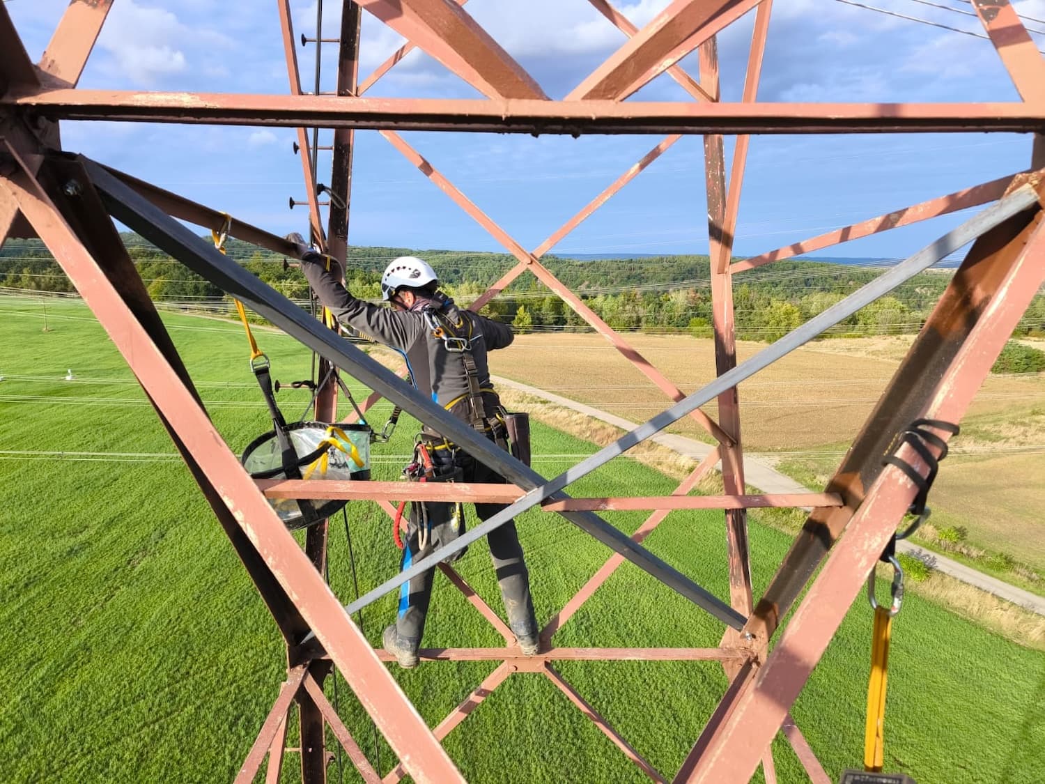 Zajišťujeme komplexní údržbu a odborné opravy ocelových konstrukcí i samotných tras nadzemních vedení. Na konstrukcích stožárů provádíme výměny deformovaných příček a stupaček, odstraňujeme zjištěné montážní vady (doplnění chybějícího či výměna nevyhovujícího spojovacího materiálu) a realizujeme statické zesilování stožárů montáží dodatečných profilů. V rámci údržby na úrovni terénu provádíme odborné sanace betonových patek, obnovu uzemňovacích soustav a aktualizaci orientačního i výstražného značení. Přímo na vedení pak zajišťujeme výměny poškozených izolátorových řetězců (nebo jednotlivých talířů) a specializované opravy fázových vodičů i zemnicích lan. Veškeré servisní zásahy provádíme jak ve vypnutém stavu, tak případně i metodou prací pod napětím (PPN), pokud to technologické a bezpečnostní podmínky umožňují.