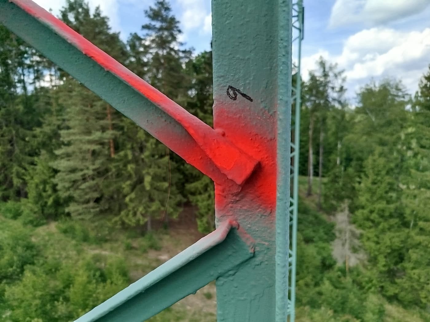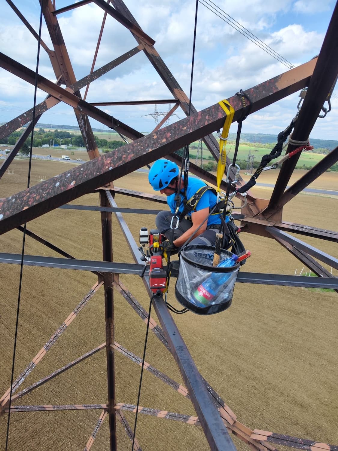 Provádíme komplexní aplikaci ochranných nátěrových systémů na ocelové konstrukce stožárů a průmyslové objekty. Zajišťujeme jak obnovu nátěrů stávajících konstrukcí ve výškách pomocí lanové techniky, tak i nátěry nových či demontovaných dílců na zemi. Celý proces zahrnuje důkladnou přípravu podkladu dle platných norem (mechanické očištění, odmaštění) a následnou aplikaci vícevrstvých systémů s dlouhodobou životností, včetně provádění denního leteckého výstražného značení. Při práci klademe maximální důraz na precizní zakrytí a ochranu prvků, které nesmí přijít do styku s barvou. Nedílnou součástí našich postupů je také striktní dodržování ekologických standardů, bezpečná manipulace s nátěrovými hmotami i ředidly a důsledná ochrana okolního životního prostředí před kontaminací.